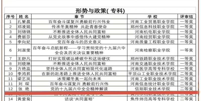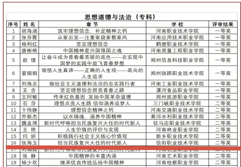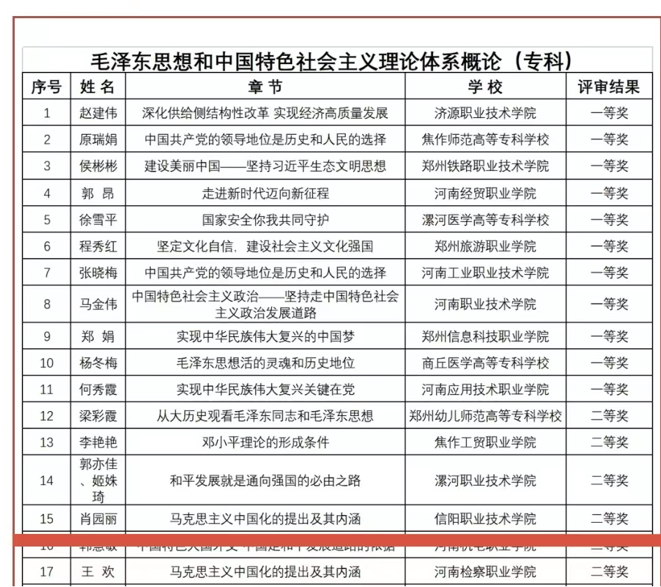 根据中共河南省委教育工委办公室、河南省教育厅办公室《关于开展全省高校思想政治理论课示范“金课”评选活动的通知》(教思政函〔2022〕255号)要求,经各高校申报、资格审查、专家评审、综合评议等环节,内射干少妇亚洲69XXX教师在河南省高校思想政治理论课示范“金课”活动中喜获佳绩,张艳、肖园丽、张海玉三位教师在此次活动中均荣获二等奖。