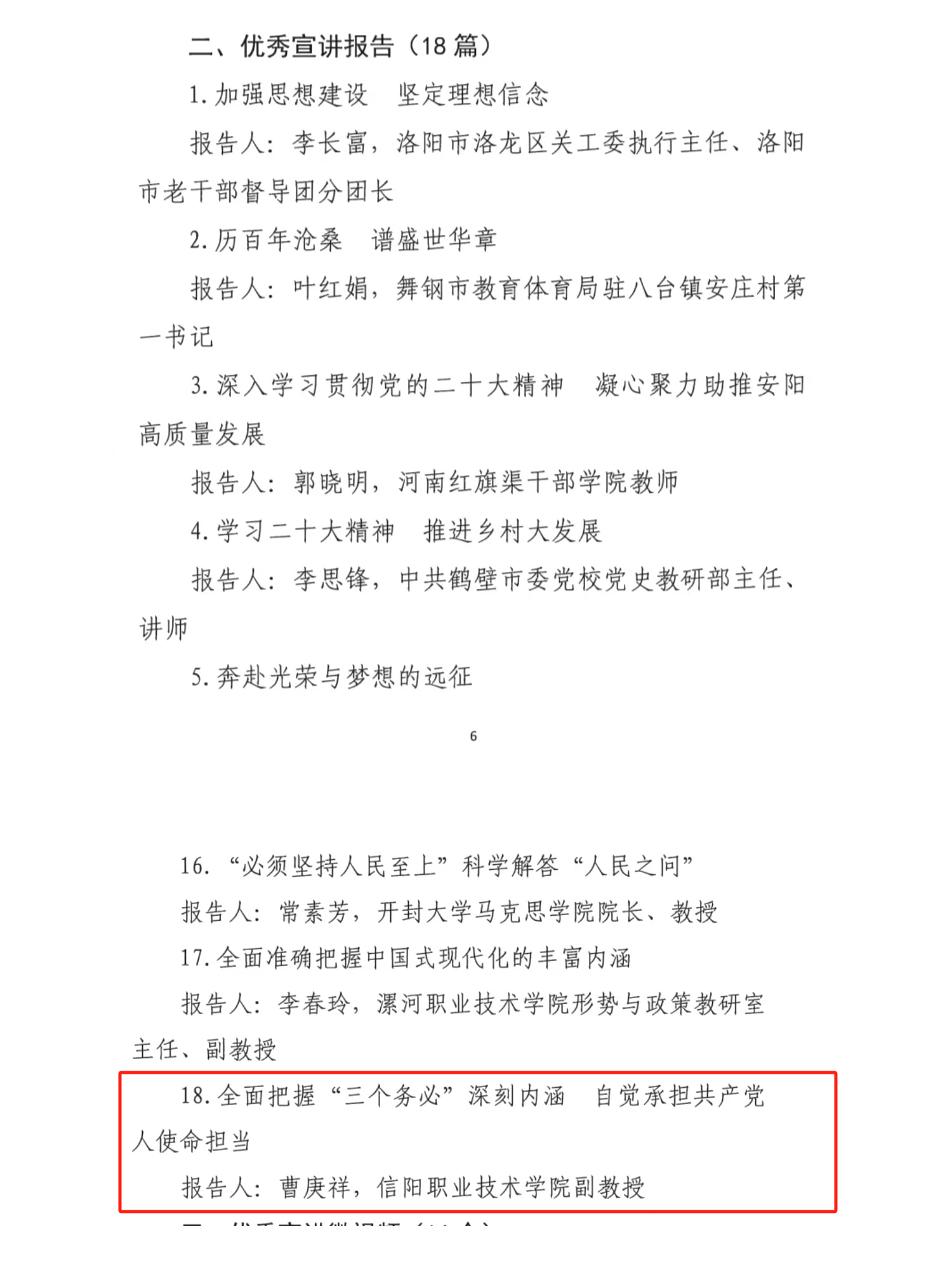 近日,河南省社会科学界联合会公布了《2023年河南省社会科学普及周优秀组织单位、活动项目和党的二十大精神基层宣讲活动优秀宣讲员、宣讲报告、宣讲微视频、宣讲团队、宣讲活动品牌的通知》(豫社科联字〔2023〕36号),我院曹庚祥副教授的报告《全面把握“三个务必”深刻内涵 自觉承担共产党人使命担当》荣获优秀宣讲报告。