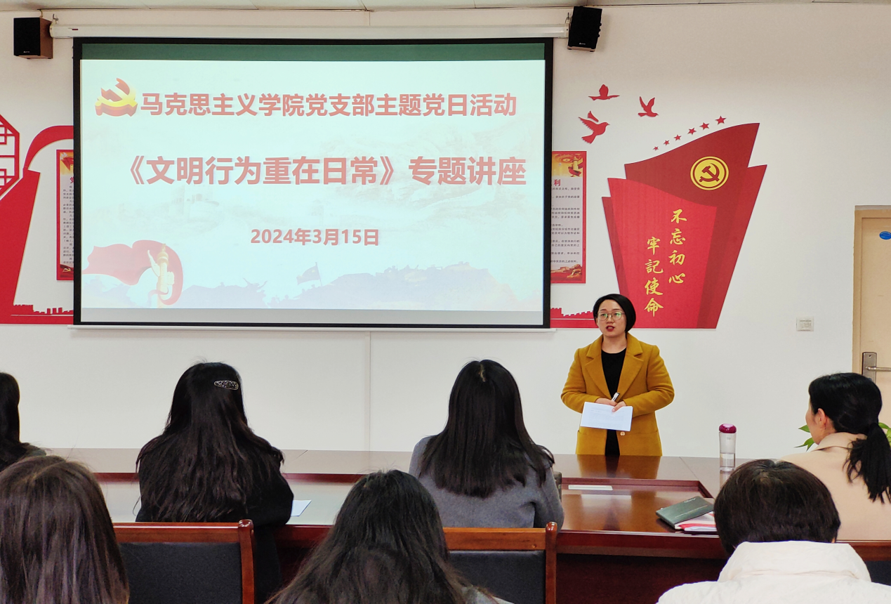 主题党日活动以专题讲座的形式开展,青年教师肖园丽围绕学习《河南省文明行为促进条例》、《信阳市文明行为促进条例》(以下简称《条例》),以《文明行为重在日常》为题作报告。她从“提高社会文明程度”、“学习两个《条例》”、“文明行为养在日常”三个方面就《条例》中的部分内容例举具体事例分别予以阐述,号召大家在日常生活中以《条例》行为规范为遵循,从自身做起,深入践行社会主义核心价值观,做文明人、说文明话、办文明事、行文明礼,成为文明行为的践行者和传播者,切实将文明行为落到实处。